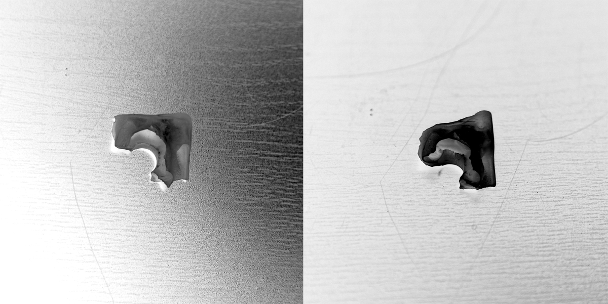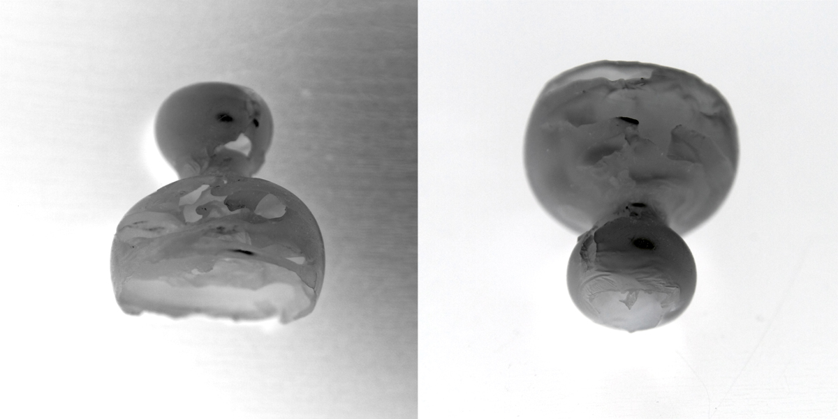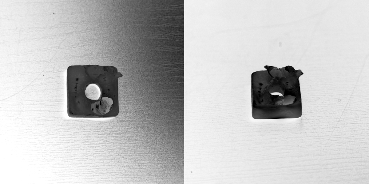 These tests use the implosive energy released when boiled wax is mixed with cold water. This series includes tests with water soluble and water insoluble liquids, as well as liquids with different acid and base values.