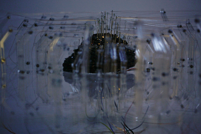 The first is the chemical computers[64] developed by British Cybernetician Gordon Pask. The [64] image presents a schematic of an electrode array embedded in ferrous sulphate, a conductive medium. Electricity flows through the material in unpredictable ways that form random circuits within matter[65]. Another example is the media art Irrational Computing created by the artist Ralf Baecker[66][67]. Through the work, Baecker tests the material, esthetics and potentials of the digital through computational experiments with semiconductor crystals, the material basis for information technology. The artist seeks to reveal the poetic boarder between “accuracy” and “chaos”. A final example is the project Silent Barrage, a collaboration between Philip Gamblen, Guy Ben-Ary, Peter Gee, Dr. Nathan Scott, Brett Murray and Dr. Steve Potter Lab[68][69]. The piece takes movement of the audience within the exhibition space and feeds it to cultured nerve cells in petri dishes, where neurological activity is then output to robotic poles that document the activity.