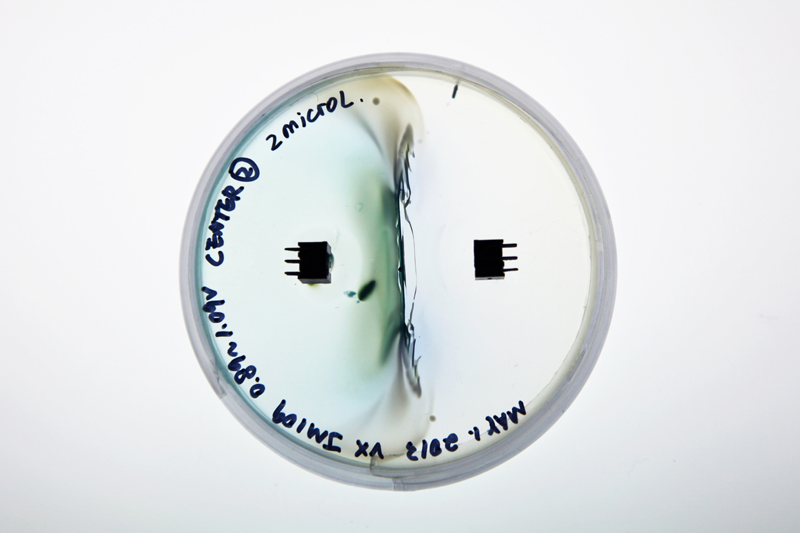 Living Devices is a series of research methods, lab protocols, hardware developments and experiment specimens that seek to break down the barrier between machine and organism by transforming electric signals into emergent bacteria growth patterns within a single device. The device allows access into the living system of bacteria through electric stimulation and manipulate their growth outcome to form visual pattern.